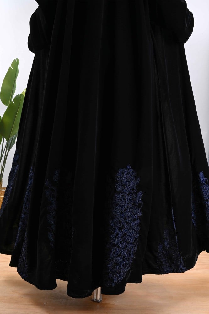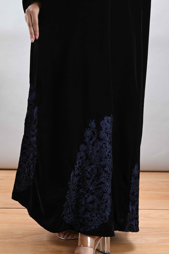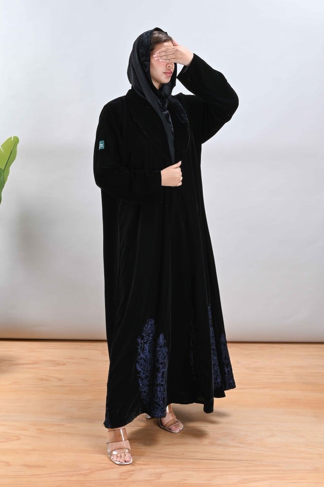 رقم العباية : 50020الإضافات: تطريز أسفل العباية باللون الكحلي.نوع الكم : صغيرنوع القفلة : لف.القماش : مخمل.اللون : اسودطرحة مجاناً مع كل عباية